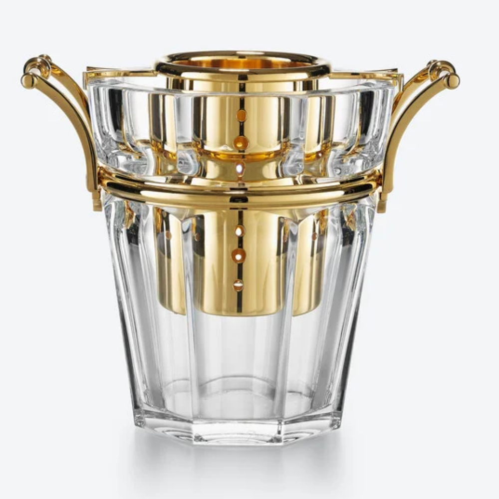 En el corazón de la suntuosa colección Harcourt, el sello de champán de Baccarat ofrece al cristal un nuevo papel, elegante y lujoso. Símbolo de elegancia, el champán se adorna en el entorno más bello posible. La cubeta para champán Harcourt realza la pureza del cristal transparente con asas plateadas o doradas, convirtiéndola en un lujoso elemento de mesa.
