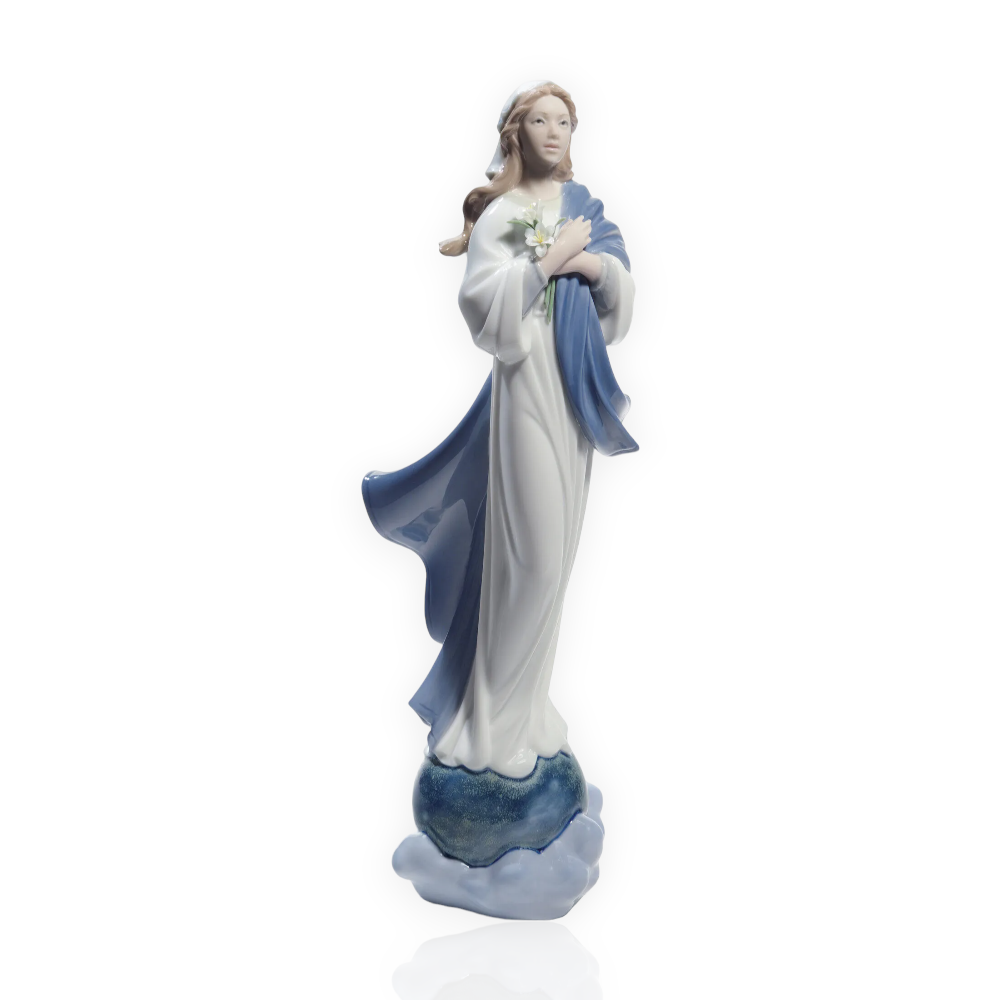Una pieza de porcelana brillo, decorada con suaves tonos pastel, además del intenso azul del manto y los esmaltes de la base.