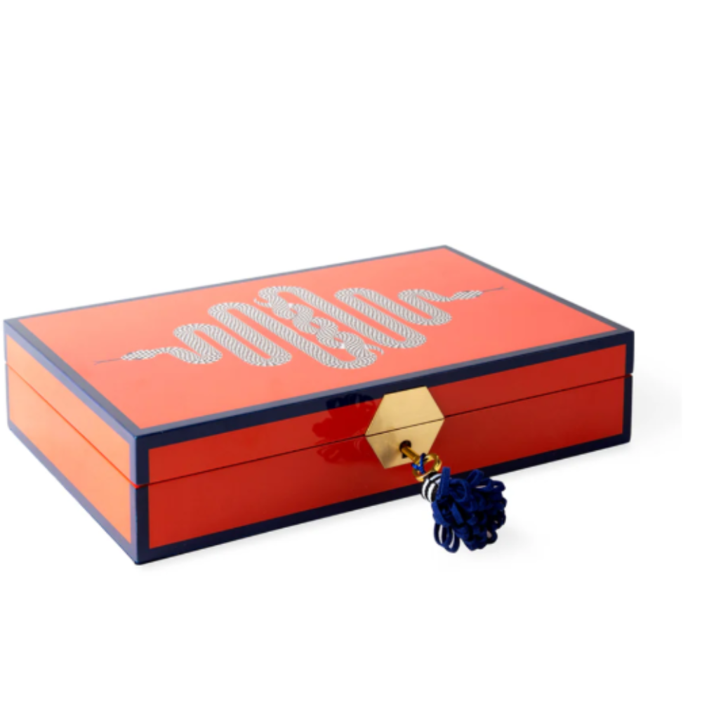 Dale a tus adornos un lugar pulido para descansar con nuestro joyero lacado Eden de alto brillo, acabado a mano. Presenta un dúo intrincadamente entrelazado de serpientes doradas deslizándose sobre un fondo naranja brillante y un lujoso interior forrado de terciopelo azul marino.