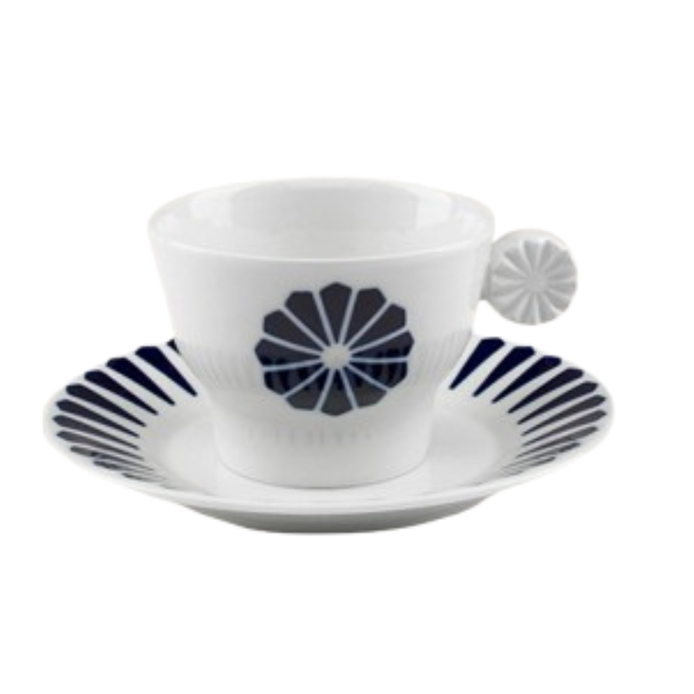 Taza de desayuno con plato perteneciente a la colección Estrela que toma como inspiración principal el símbolo de la estrella y las formas de la alfarería tradicional.