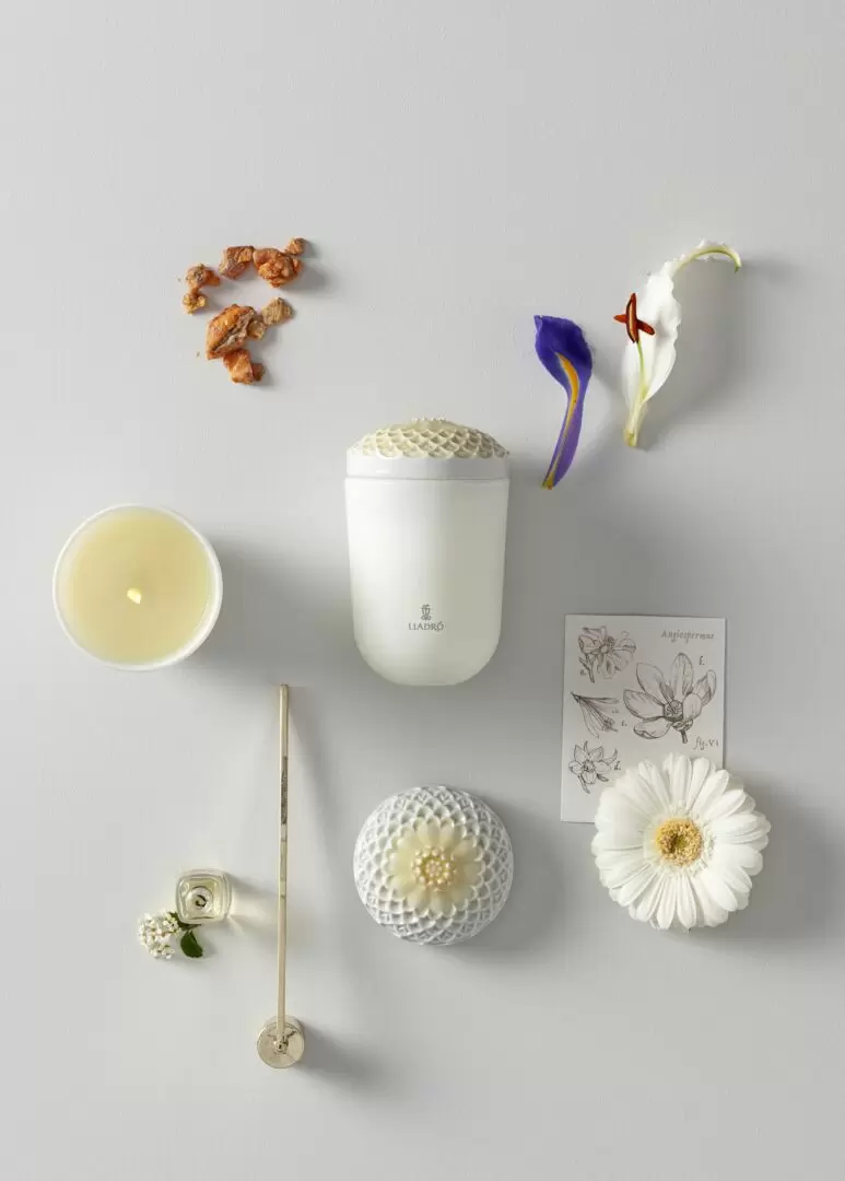 Las velas de Echoes of Nature están inspiradas en el poder evocador de los aromas que encontramos en la Naturaleza. Inspiran su presentación en el componente principal de cada fragancia o en el argumento principal de cada aroma que se representa en el relieve y color de cada tapa. La fragancia Playa Mediterránea es un perfume afrutado con matices de flor de naranjo y un fondo amaderado. Toda la frescura del Mediterráneo en casa. Una invitación a escapar de lo cotidiano en una vela cubierta por una elaborada tapa de porcelana brillo, grabada y pintada a mano con un diseño exclusivo que es una metáfora de la fragancia que atesora, en este caso representa a una estrella de mar. Contiene 200 gramos (7.05 oz) de cera natural y su duración es de 45 horas. Incluye hasta un 10% de perfume en su formulación y la mecha no produce humo. Una vez consumida la cera, los vasos de esta colección se convierten en objetos decorativos que a su vez pueden servir de caja o de joyero con el toque artístico de la porcelana hecha a mano en Valencia, España.