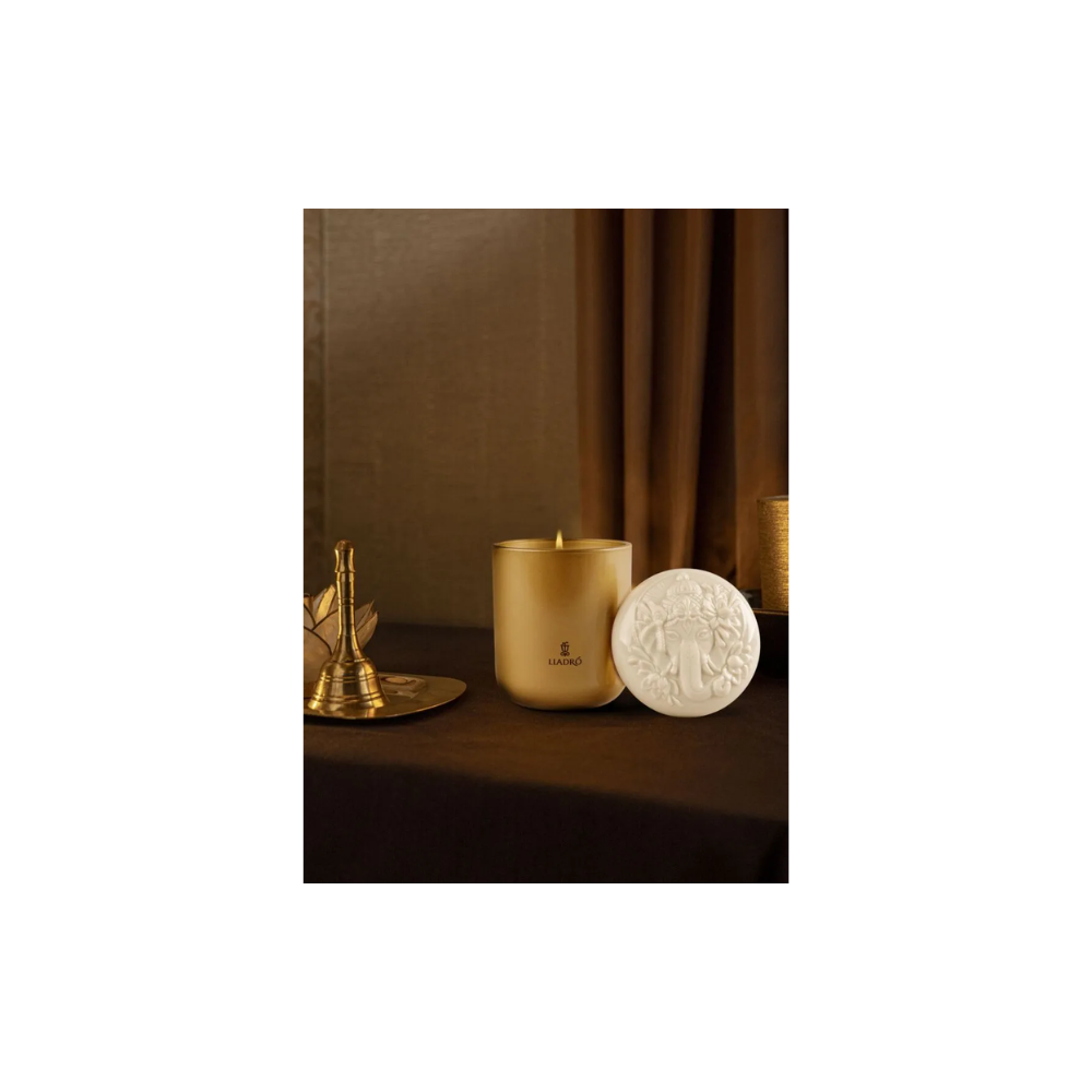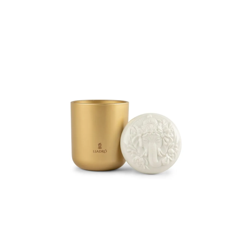 Portavelas con grabado de Lord Ganesha y perfume Jardines de Valencia. Una delicada fragancia con notas cítricas y frutales, de bergamota, tuberosa, sándalo y almizcle