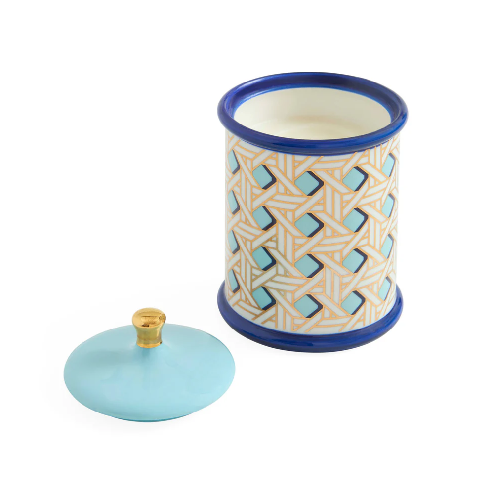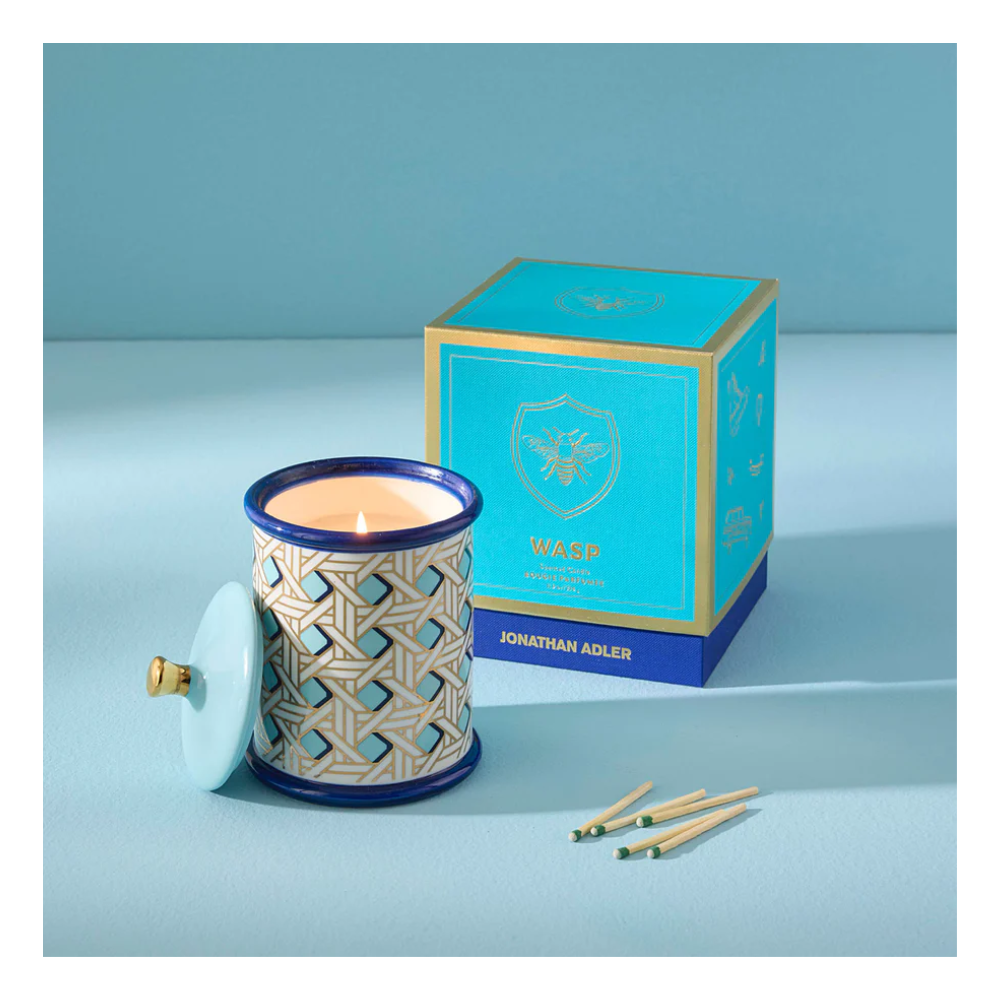 Nuestra vela Avispa Dorada se vierte en un recipiente de porcelana de alta cocción, envuelto en el clásico tejido Palm Beach, con detalles dorados y un acabado esmaltado brillante. Con una tapa extraíble, es el recipiente perfecto para guardar tus secretos después de que la vela se consuma.